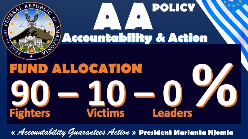 The proportion of resources assigned to IG officials or any other diasporan leader of the Ambazonian Liberation Struggle is 0%. The rationale is that we of the diaspora must sacrifice materially and financially to complement the higher sacrifice of the Restoration Forces and the civilians on the ground.